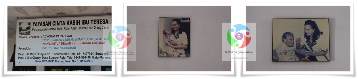 Yayasan Cinta Kasih Ibu Teresa berdomisili di Jalan Bringin no.5 Sambikerep surabaya dan di Villa Chery, desa Sumber Rejo Batu Malang. dikelola oleh Pdt TSE Ratna Susiani dan beberapa pengurus yang lain.